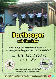 Zum Dorfhoagat laden wir euch herzlich am Samstag, 18.10.2025 um 19 Uhr in das Bürger- und Vereinsheim ein. Vereinseigene Gruppen, unter anderem die Kinder- und Jugendgruppe, zeigen Volkstänze und Plattler. Auch musikalisch wird der Vereinsletzt von vereinseigenen Musikanten umrahmt. Höhepunkt des Abends ist ein Einakter, gespielt von der Theatergruppe des Trachtenvereins.